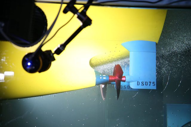 在韓華海洋的共振水池中,他們進行了研究,旨在提高潛艇的推進力同時減少噪音。在潛