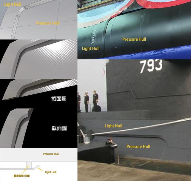 個人總結 1. 一般Single-Hull潛艇的設計,中段本來就有一個外側軟殼的開口 2. 外側軟殼與內側壓力殼,在上端會留有空間以便排水 3. 軟殼邊緣一般會做內凹收邊 4. 軟殼形狀是用來形成流線型,水會填入到與壓力殼之間,達到壓力平衡 蒙皮間有縫隙或稍有不平整並不罕見 -- ※ 發信站: 批踢踢實業坊(www.ptt-site.org.tw), 來自: 219.85.180.204 (臺灣) ※ 文章網址: https://www.ptt-site.org.tw/Military/M.1696145911.A.2A9 ※ 編輯: Aerci (219.85.180.204 臺灣), 10/01/2023 15:43:45