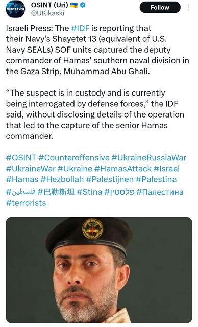 這個人叫Muhammad Abu Ghali 沒聽過? 沒關係☺ 駐守在哈馬斯南部的海軍師副指揮官總聽過了吧 以色列海軍的Shayetet 13特種部隊 (層級相當於美國海軍的海豹突擊隊) 快速的發動突襲作戰把這個人直接逮捕 https://i.imgur.com/KxSBW1W.jpg