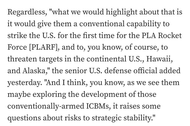 這位美國高級國防官員沒有詳細說明 這種以戰略常規洲際彈道飛彈的發展可能存在哪些風險 但存在一些明顯的令人擔憂的影響 為解放軍開發這種系統的一個可能目標 是擁有一種非核武器將戰略目標置於美國境內的任何地方 或世界上任何地方 而不必升級到使用核武 這可以對針對中國的非核打擊提供強大的威懾 目前中國最遠的常規非核力量大約可以投射到5500公里等級 https://i.imgur.com/1uVGG6N.jpg