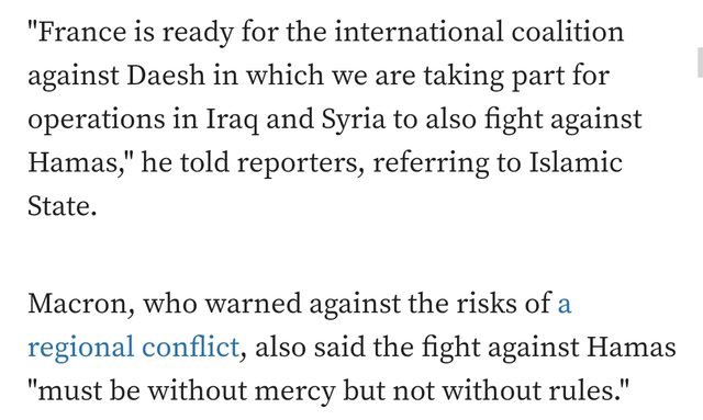 在訪問以色列期間 馬克宏沒有詳細說明 以美國為首的由數十個國家組成的聯盟要如何參與 因為以色列不是反恐聯盟的成員 以美國為首的打擊伊斯蘭國反恐聯盟於2014年9月成立 馬克宏在耶路撒冷與以色列總理Benjamin Netanyahu一起發表講話 強調法國和以色列將恐怖主義視為共同的敵人 他對記者說 法國已準備好加入打擊伊斯蘭國的國際聯盟 我們(法國)正在參與該聯盟在伊拉克和敘利亞的行動 同時打擊哈馬斯 馬克宏對地區衝突的風險發出警告 他還表示針對哈馬斯的戰鬥必須毫不留情,但不能沒有規則 https://i.imgur.com/rZE58y1.jpg