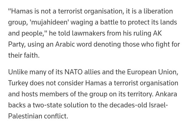 https://reurl.cc/RyRdZZ 路透社報導 他對執政的正義與發展黨議員表示 “哈馬斯不是恐怖組織,而是一個解放組織 ‘聖戰者’為保護土地和人民而進行戰鬥” https://i.imgur.com/1aKI4H4.jpg