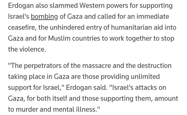 此外Erdogan譴責西方列強表示支持以色列對哈馬斯進行報復 並表示 西方為以色列流下的眼淚是欺詐的表現 https://i.imgur.com/v1XBlDC.jpg