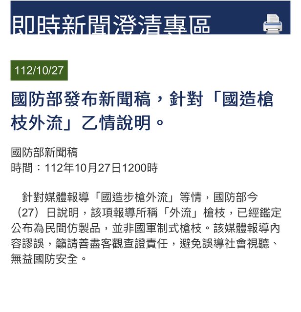 國軍步槍外流? 國防部澄清:經鑑定為民間仿製品 聯合 媒體今天報導,國軍官兵拆解槍枝零件對外販售,導致步槍遺失。國防部回應,報導所稱的外流槍枝,已鑑定公布為民間仿製品,並非國軍制式槍枝。 三立電視台報導,有國軍官兵創立社群軟體Line「賣槍班」群組,涉嫌在槍枝演練時分次拆解撞針等步槍小零件,偷出軍營後再以毀損名義向上級申報,最後賣給不肖人士從中牟利,出現國造T65K2步槍外流(今年3月)情事。 國防部中午發布新聞稿強調,報導所稱「外流」槍枝,已鑑定公布為民間的仿製品,並非國軍制式槍枝。 國防部強調,媒體報導內容謬誤,籲善盡客觀查證責任,避免誤導視聽。 https://udn.com/news/story/10930/7533940 = 昨天我貼的三立新聞,看到國防部正式回應應該要貼 國防部表示是三立假新聞 國防部回應說三月那把槍是模型 但是沒有對官兵盜賣零件群組跟盜賣零件作回應 新聞稿如下 https://i.imgur.com/IlfpZjc.jpg