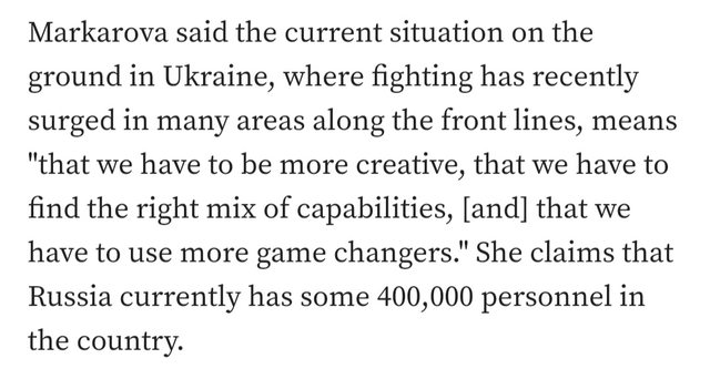 https://twitter.com/JayinKyiv/status/1717579727743901914? 回到主題 有跡象表明烏克蘭最快會在明年一月 獲得美國援助的ATACMS陸軍戰術彈道飛彈的衍生型號 烏克蘭駐美國大使Oksana Markarova今天表示 烏克蘭軍隊需要更多像ATACMS這樣的遊戲規則改變者 以持續對俄羅斯軍隊施加壓力。 Oksana Markarova表示烏克蘭目前的局勢 前線許多地區的戰鬥最近激增 這意味著我們(烏克蘭)必須更具創造力, 我們必須找到正確的能力組合 並且必須使用更多足以改變遊戲規則的裝備 https://i.imgur.com/FwB31Wx.jpg