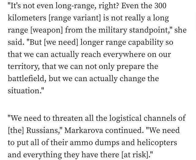 烏克蘭駐美國最高外交官特別強調了烏克蘭上個禮拜 對烏克蘭東部兩個被俄羅斯佔領的機場進行首次 ATACMS襲擊 以作為改變遊戲規則能力的例子 這些攻擊摧毀了大量直升機和其他物資 看起來已經對俄羅斯的作戰行動產生了一定的影響 此後烏克蘭軍隊又進行了至少一次ATACMS突襲 目標也就是開文章開頭的俄羅斯S-400地對空飛彈系統 Oksana Markarova昨天在華盛頓特區舉行的 2023 年軍事記者和編輯會議的問答環節中發表了上述評論 她還特別談到了能夠擊中最遠186英里(300公里)目標的ATACMS價值 到目前為止, 美國只向烏克蘭發送了射程較短的102英里(165公里)版本 https://i.imgur.com/feM7DsZ.jpg
