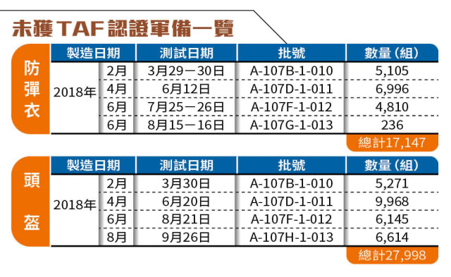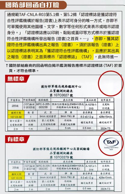 國防部回應:均符合規範 針對相關疑義,國防部回應本刊指出,TAF認證係在2017年下半年申請,2018年10月起標示TAF標章,採雙重認證,彰顯品質符合國際規範。國防部回應證實本刊掌握資料為真,但未進一步說明這4.5萬多件未獲認證裝備,究竟撥發到哪些單位,以及日後要如何追回。 = 發下去的找不到發給誰了 原型產品給美國切斯比克實驗室依NIJ(美國司法學院)Ⅲ級標準測試合格 後代產品給TAF認證 但在未獲認證前4.5萬件沒有認證的裝備不知道撥去哪裡了 看來管理的滿嚴謹的 -- 鼓勵你但強制你做 不強求但必須要做 不一定但必須要有 -e心守護 -- ※ 發信站: 批踢踢實業坊(www.ptt-site.org.tw), 來自: 111.241.29.209 (臺灣) ※ 文章網址: https://www.ptt-site.org.tw/Military/M.1698664311.A.9DA