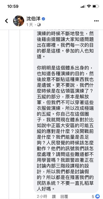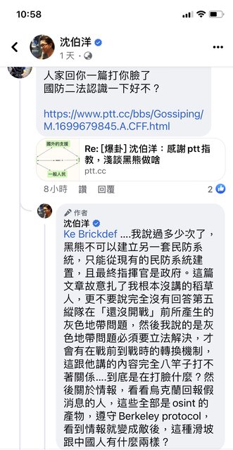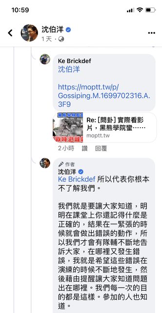 有當過兵的專家在八卦版 回應沈伯洋教授 然後被貼到他臉書上 因此沈教授有以下回覆 回覆1 https://i.imgur.com/rgjPHf7.jpg