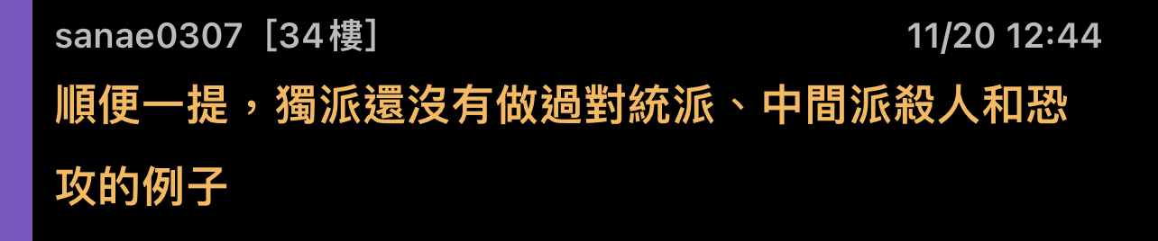 sanae0307 : 順便一提,獨派還沒有做過對統派、中間派殺人和恐 11/20 12:44