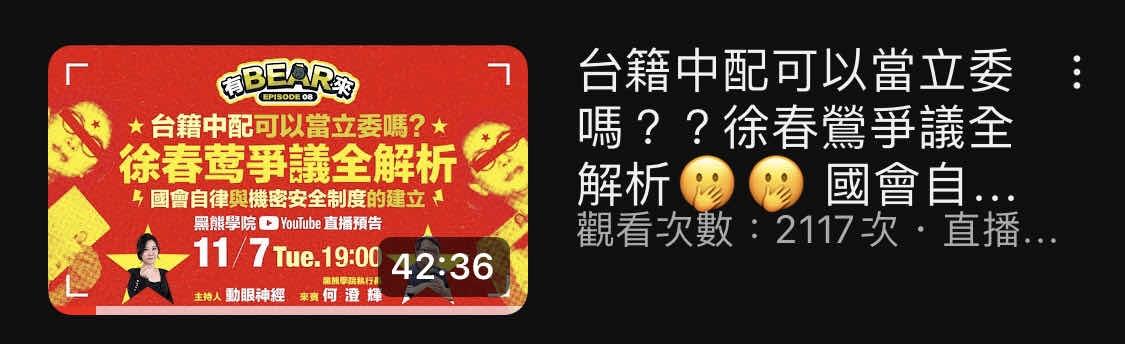 h80733 : 黑熊最新一篇直播,不是在戰外配能不能選立委? 11/20 22:33