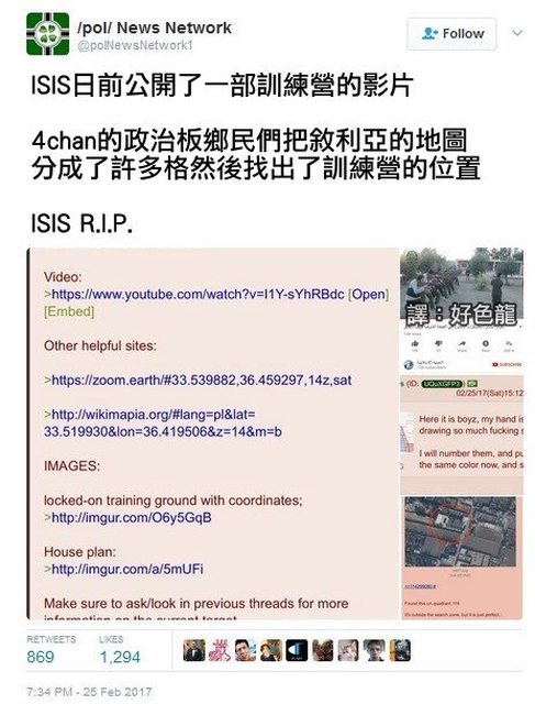 ※ 引述《NKN (99%是眼鏡與吐槽)》之銘言: : 至於民間軍事情報蒐集與反制 : 這大概就是黑熊真的有獨創性的部分 : 而且現階段台灣也沒有法規限制黑熊不能幹什麼 : 這方面他們可以很自由去發展 : 只是因為真的現在台灣沒多少人懂這是幹啥的跟能幹啥的 質疑多也正常 : 推 design0606 : 不管蒐集情報跟反情報 都不是平民該幹的事情 11/20 14:31 : → design0606 : 主動反情報≠識別假消息 11/20 14:31 民間蒐集軍事情報這部分倒是可以講講 但這個軍事情報比較廣義 包含但不限於指軍隊用的情報 先舉個例 ISIS在伊拉克敘利亞興起那一陣子 有回國外SNS的4chan上頭 就有鄉民集合起來 靠ISIS發布的訓練營照片定位他們的位置 然後有人跑去傳給美軍相關單位 ISIS訓練營就被炸了 http://i.imgur.com/MKoy7NU.jpg