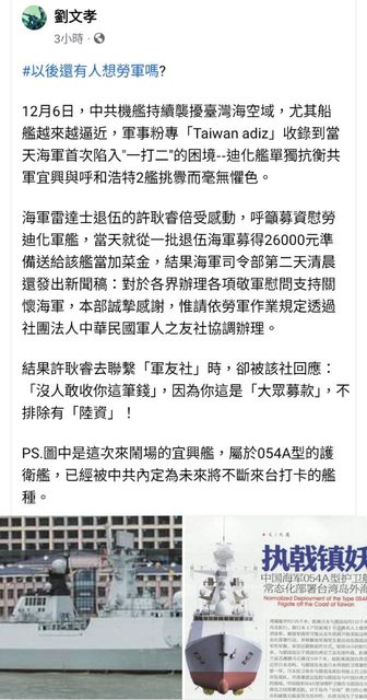 jobli : 還敢發文說捐錢只能透過軍人之友社" 12/10 21:02