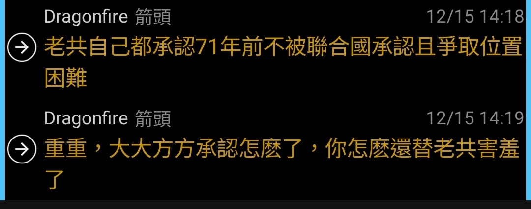 Dragonfire : 老共自己都承認71年前不被聯合國承認且爭取位置困難 12/15 14:18