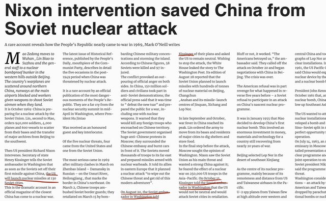 緊急約見了當時的美國總統國家安全事務助理季辛吉 Dobrynine非常嚴肅的向季辛吉詢問 關於如果蘇聯攻擊以及破壞中國的核裝置的話 美國的立場如何 如果中國請求美國的援助,那麼美國會做出什麼舉動 季辛吉當時表示 中國和蘇聯的大規模衝突將可能會導致不可預測的結果 美國肯定要防止大衝突的發生 於是轉眼在8月28日 美國華盛頓明星報馬上刊登了一篇文章 標題叫做 蘇聯要對中國做外科手術式核打擊 "The Soviet Union wants to do a surgical nuclear attack on China" 文章提到根據可靠消息 蘇聯計畫使用中程彈道飛彈 攜帶百萬噸級核彈頭 對中國的酒泉 西昌飛彈發射基地 羅布泊核試驗基地 以及北京 長春 鞍山等重要工業城市進行外科手術式的核打擊 https://i.imgur.com/fnTH4om.jpg
