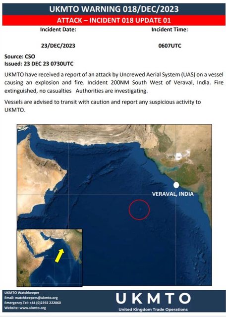 如題啦 就在幾個小時前 有一艘與以色列有聯繫 懸掛賴比瑞亞國旗的化學品油輪 M/V Chem Pluto在印度洋航行時被無人機擊中 當時那一艘船距離印度港口城市Veraval西南約200海里(大約370公里) https://i.imgur.com/CR7LOdU.jpg