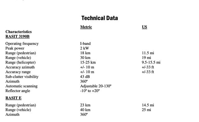RASIT性能參數 翻譯對照 ========== RASIT 3190B 雷達工作波段:I波段 雷達峰值功率:2kW 行人目標搜索距離:18公里 車輛目標搜索距離:30公里 直升機目標搜索距離:15-25公里 精度方位角:正負10公尺 精度範圍:正負10公尺 雜波能見度:43 dB 雷達旋轉角度:360度 雷達自動掃描角度:20-130度間可調節 反射角度:負10至正20度 RASIT E(增程版) 行人目標搜索距離:23公里 車輛目標搜索距離:40公里 雷達旋轉角度:360度 ========== https://i.imgur.com/fI7hrNg.jpg