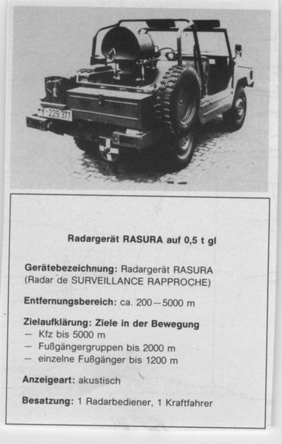第11裝甲擲彈兵師裝甲偵察營雷達組 西德也於1969年採購RASURA系統以雷達排(Radarzug,RadarZg)的型式編組進各師的裝甲 偵察營(Panzeraufklärungsbataillon,PzAufkBtl),作為師前衛偵察部隊偵察敵情。 https://i.imgur.com/qVm9RU8.jpg