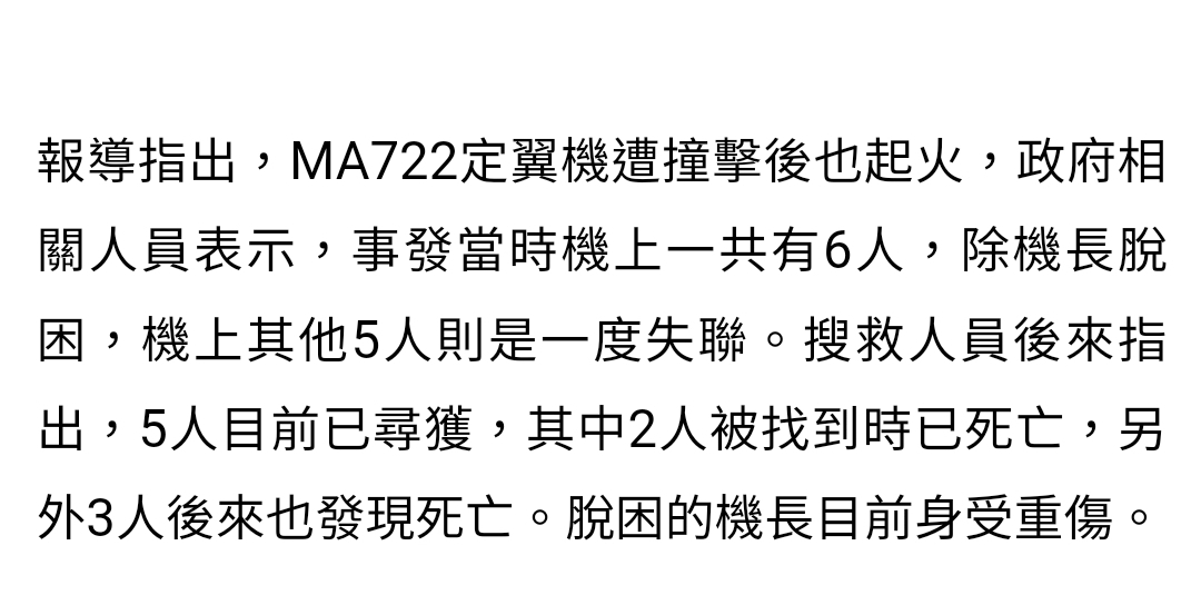 推 mmmimi11tw : MA722確定只有機長存活 機上的五人已經罹難 01/02 19:57