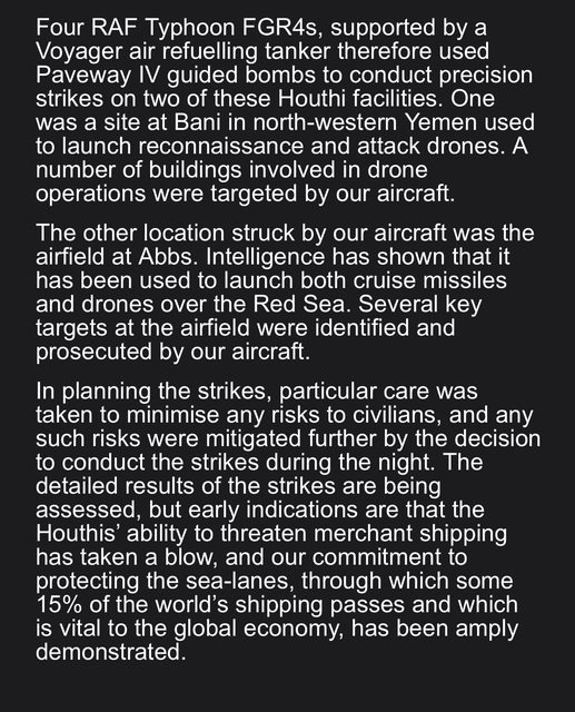多個影片聲稱展示了葉門的襲擊 人們看到和聽到了重大爆炸 https://x.com/sentdefender/status/1745598593854046306? https://x.com/clashreport/status/1745596235426246916? 裝載有100多枚戰斧巡弋飛彈的佛羅里達號 俄亥俄級巡弋飛彈核潛艦參加了這次打擊 英國皇家空軍颱風FGR4戰機也參與了空襲 https://i.imgur.com/jYZhPAD.jpg