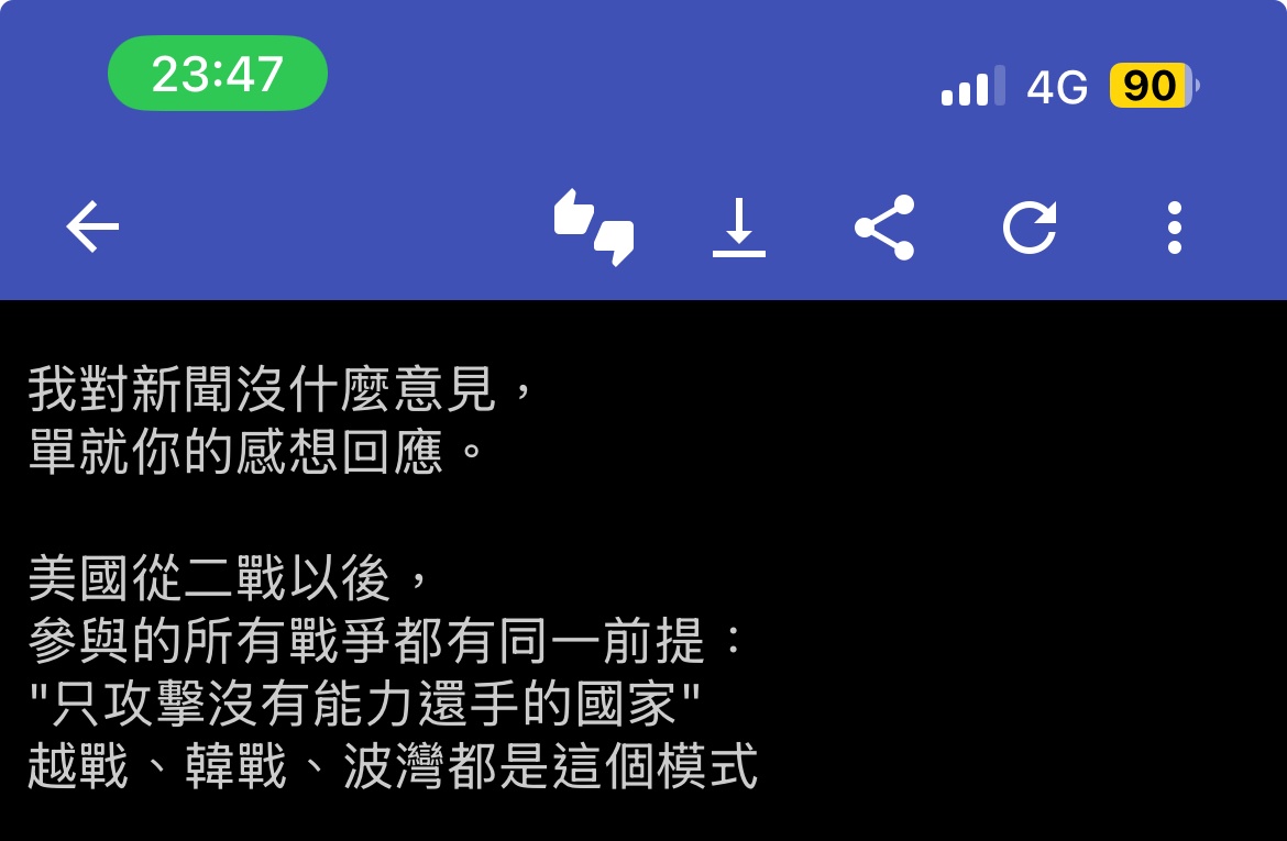 → iaminnocent : 照你這樣講45年沒開戰,大使館被炸也沒反擊的怎麼 06/22 22:49