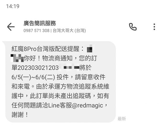 → seedk869: 那簡訊是紅魔自己發的也不是物流發的 可信度低 06/02 22:58