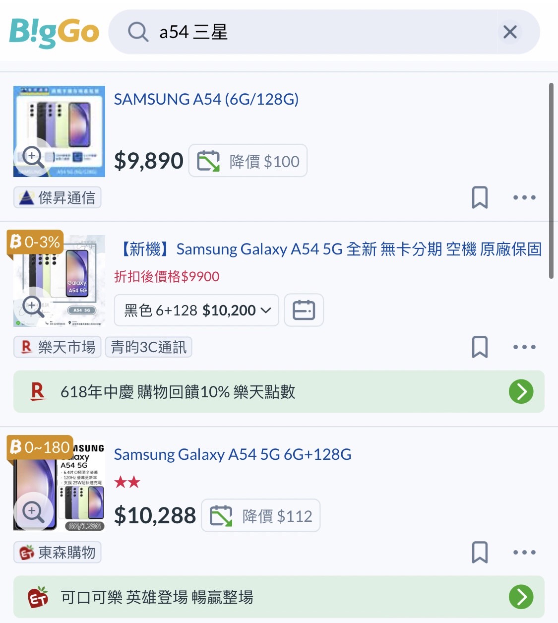 → swordrainbow: 但A54現在已經跌到1萬以下了,網購扣掉導購、信用卡 06/12 17:54