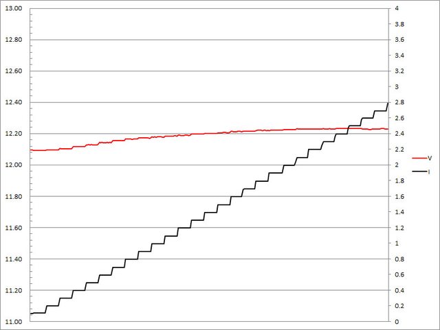 ▼固定檔12V輸出負載測試,隨著電流增加,輸出電壓上升,輸出電流超過2.7A截止