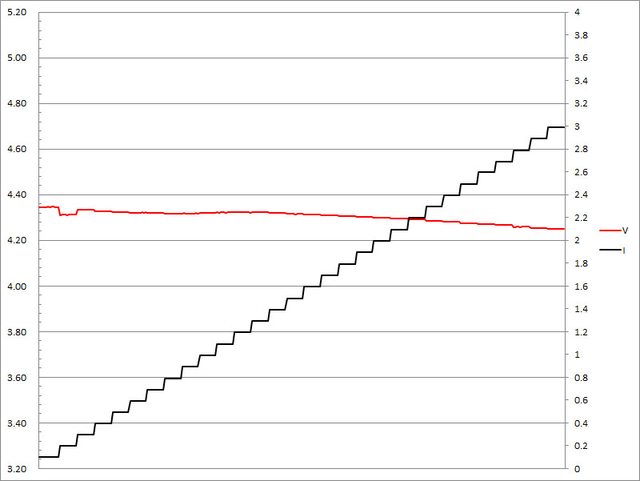 ▼PPS檔4.2V輸出負載測試,隨著電流增加,輸出電壓下降,輸出電流超過3A截止