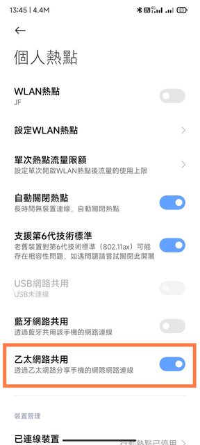 對,那個乙太網路共享是我剛剛在手機設定裡發現,所以我目前還不太清楚