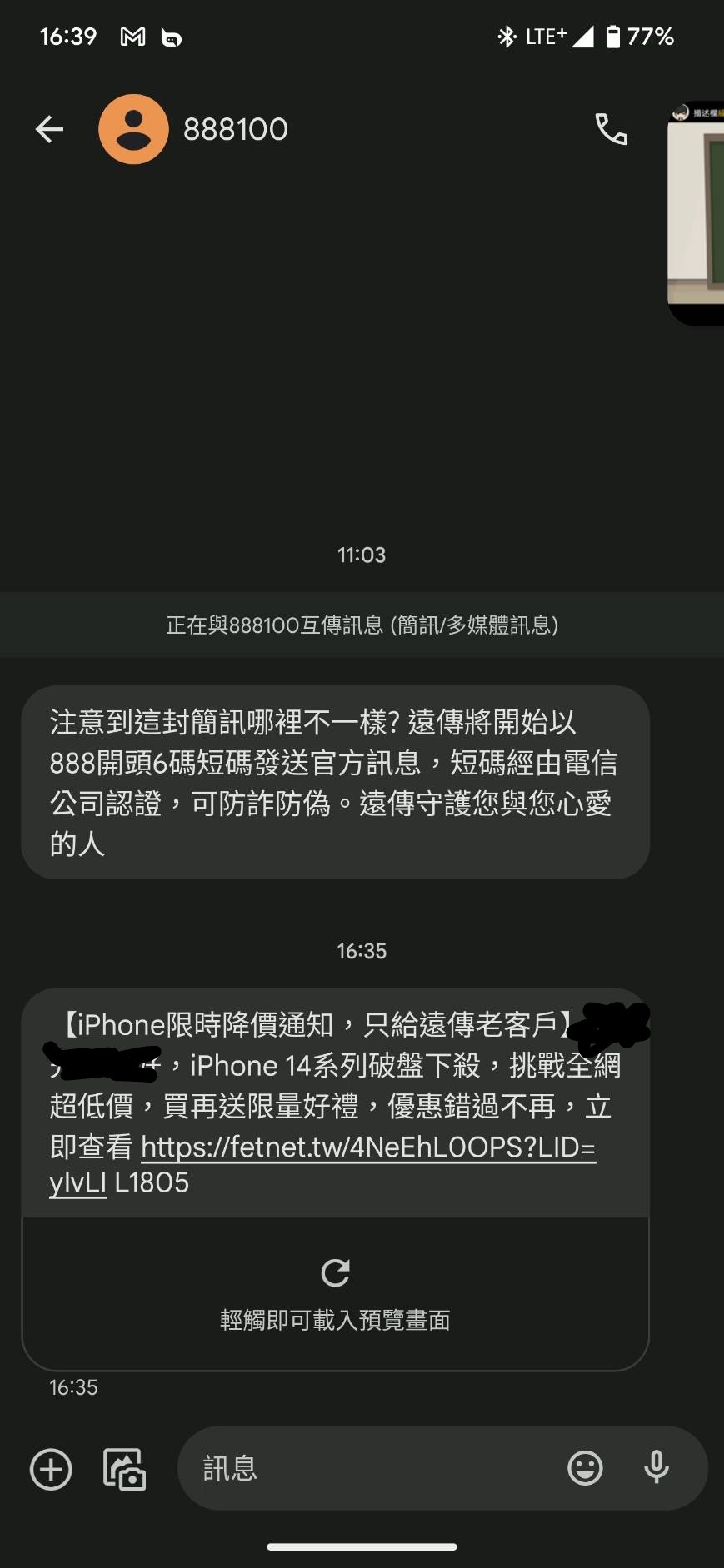 推 f77928 : 現在我除了驗證碼或者包裹到貨 其他簡訊都當成詐騙 08/27 20:46