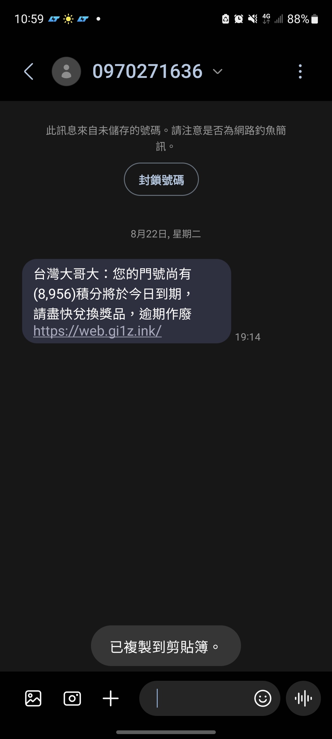 → lolicat : 有收到假冒台灣大哥大傳的 但我早NP了 一看就是詐騙 08/27 14:19
