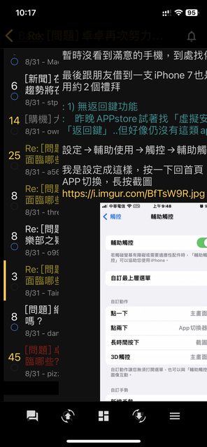 : 2) 還是因為我的舊機太舊 所以app會自動過濾? 只選給舊機能用的? 會這樣嗎? 太舊的機型iOS 版本過低會不支援 : 3) 安卓有一種app例如螢幕抓圖或快照 可以浮動一個圓圈圈 當虛擬按鈕 : 目前apple有沒有這類機制? 然後可以裝作代替返回鍵嗎? 一樣在輔助使用設定 https://i.imgur.com/aPd82ox.png
