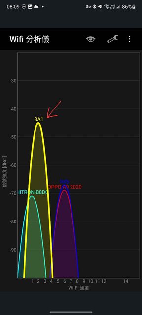 但利用wifi分析儀app查看發現通道9~14比較沒有其他訊號干擾