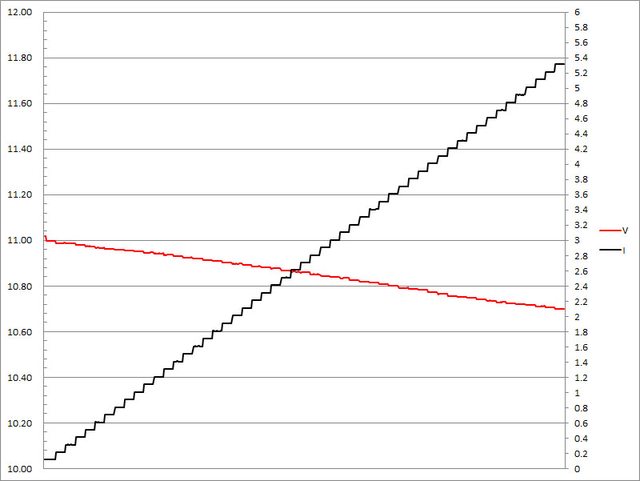 輸出電壓下降,輸出電流超過6.4A壓降,超過6.5A截止