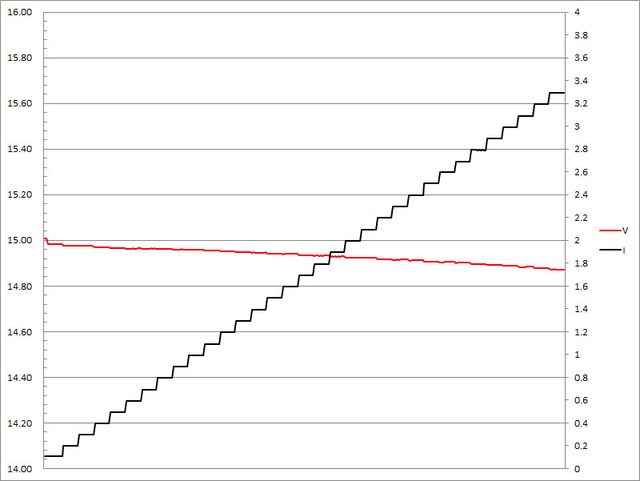 ▼固定檔15V輸出負載測試,隨著電流增加,輸出電壓下降,輸出電流超過3.3A截止