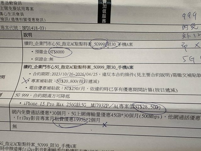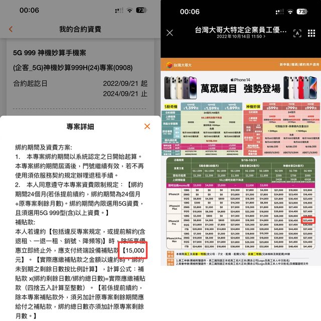 小弟上個月跟家人去辦了台哥大企客續約iPhone 15 pro 256g時發現一個問題, 手機搭企客999(24),價格是26800 以15 pro 256g原價40400算起來, 其實才折扣13600, 但是違約金卻是15000按日遞減, 今天辦了遠傳企客999(30)搭15 pro max 256g的價格是28500,手機折扣是16400 但是違約金卻是20800按日遞減 記得我去年辦門號時,手機的折扣價跟 違約金是一樣的, 現在這樣是不是不太合理 https://i.imgur.com/UBsP605.jpg