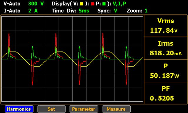 ▼USB-C1輸出20V/2.3A的交流電壓/電流/功率波形如下圖所示