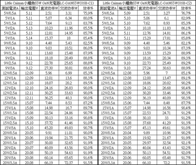 ▼USB-C1(左)/USB-C2(右)單獨使用下各組輸出轉換效率表,整體輸出轉換效率在75.9%至