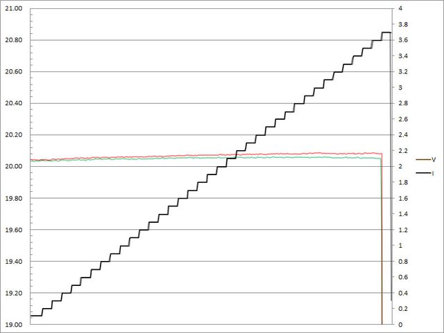 壓微幅上升,輸出電流超過3.6A壓降,超過3.7A截止