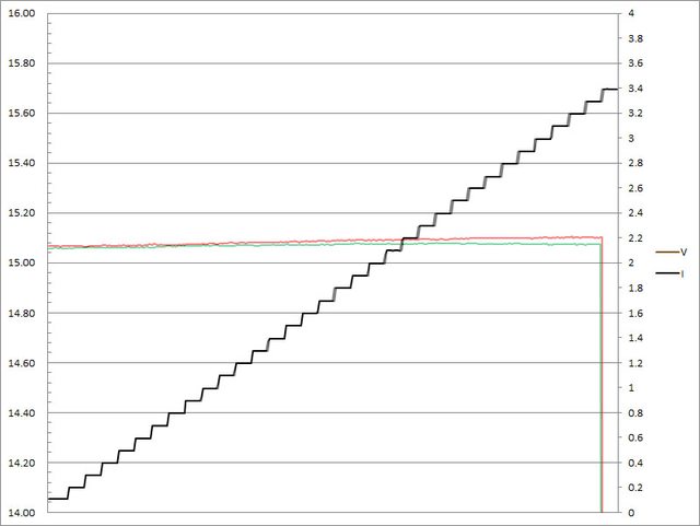 壓微幅下降,輸出電流超過3.3A壓降,超過3.4A截止
