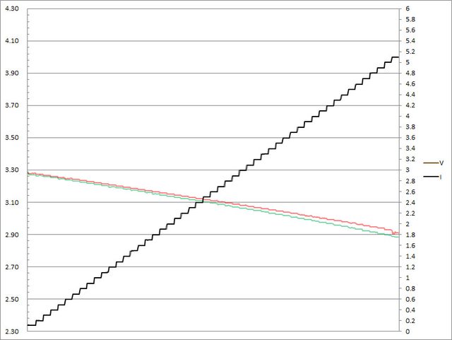 壓微幅上升,輸出電流超過3.3A壓降,超過3.4A截止