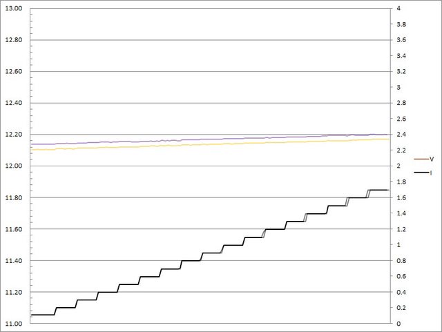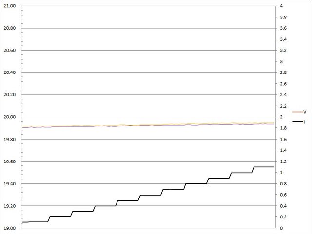 C1輸出電流超過5.2A大幅壓降,超過5.3A截止;C2輸出電流超過5.4A大幅壓降,超過5.5A