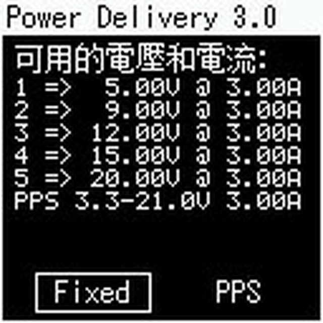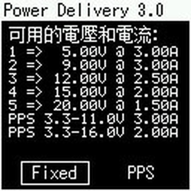 、9V/3A、12V/2.5A、15V/2A、20V/1.5A,PPS檔提供3.3V-11V/3A及3.3V-16V/2A