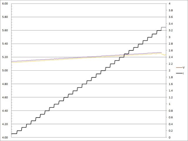 ▼C1(紅)/C2(綠)搭配5A線材的固定檔5V輸出負載測試,隨著電流增加,輸出電壓上升,