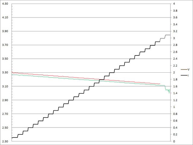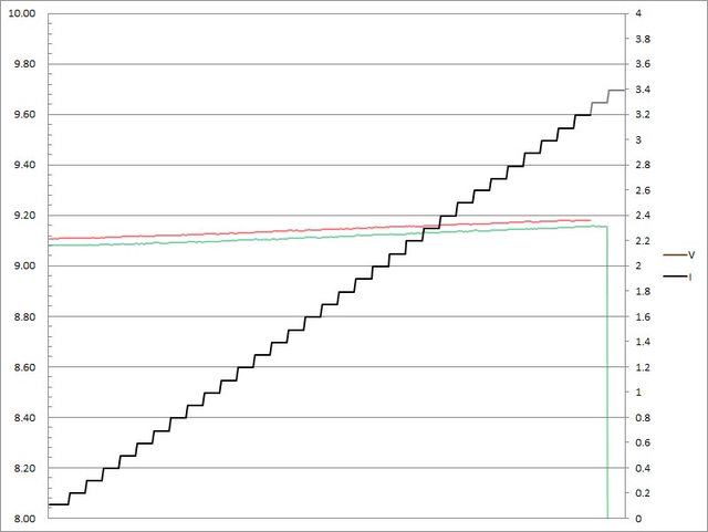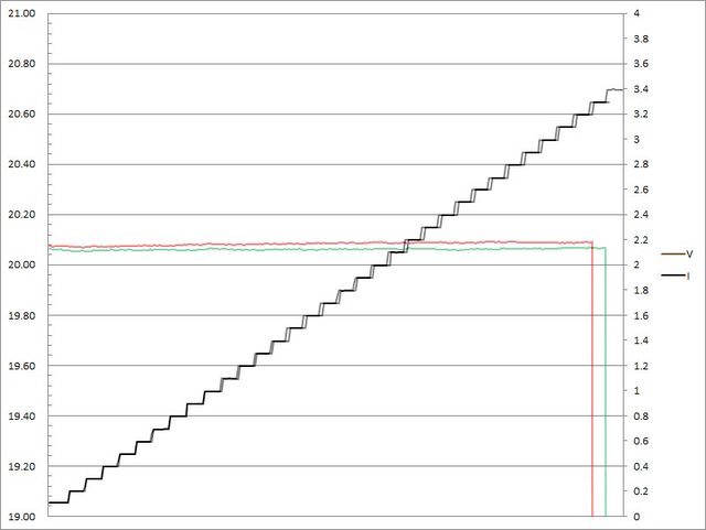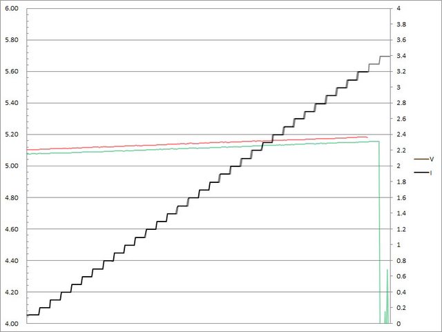 C1輸出電流超過3.2A截止;C2輸出電流超過3.3A大幅壓降,超過3.4A截止