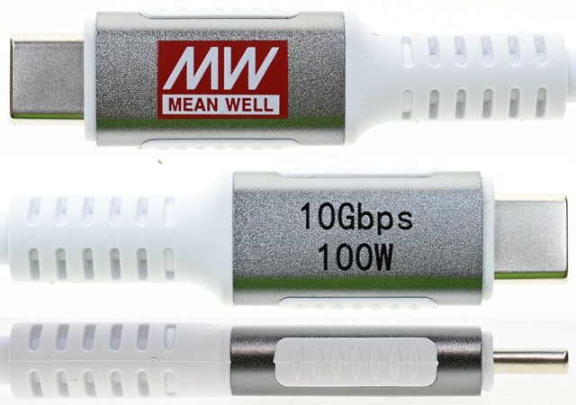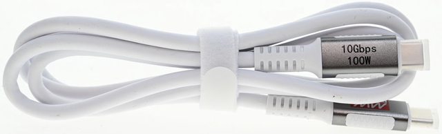 色金屬外殼其中一面有10Gbps 100W字樣,金屬外殼兩側露出白色防滑區域,並具備白色