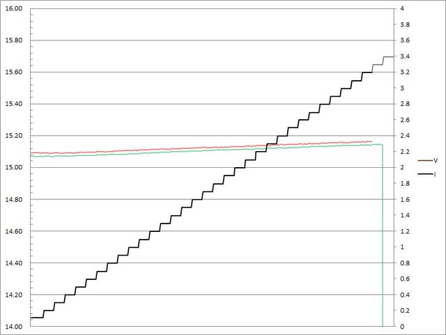 ▼C1(紅)/C2(綠)搭配5A線材的固定檔15V輸出負載測試,隨著電流增加,輸出電壓上升,