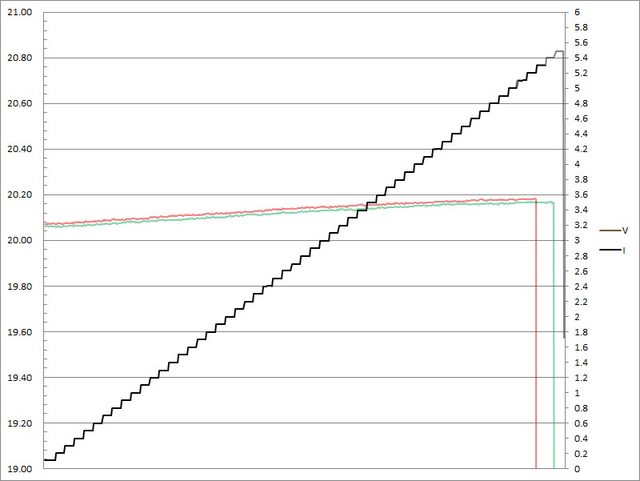 ▼C1(紅)/C2(綠)搭配5A線材的固定檔20V輸出負載測試,隨著電流增加,輸出電壓上升,