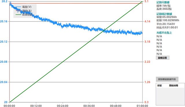 ▼C1輸出100W可連續維持一小時不中斷,輸出電壓變動程度如圖表藍線所示