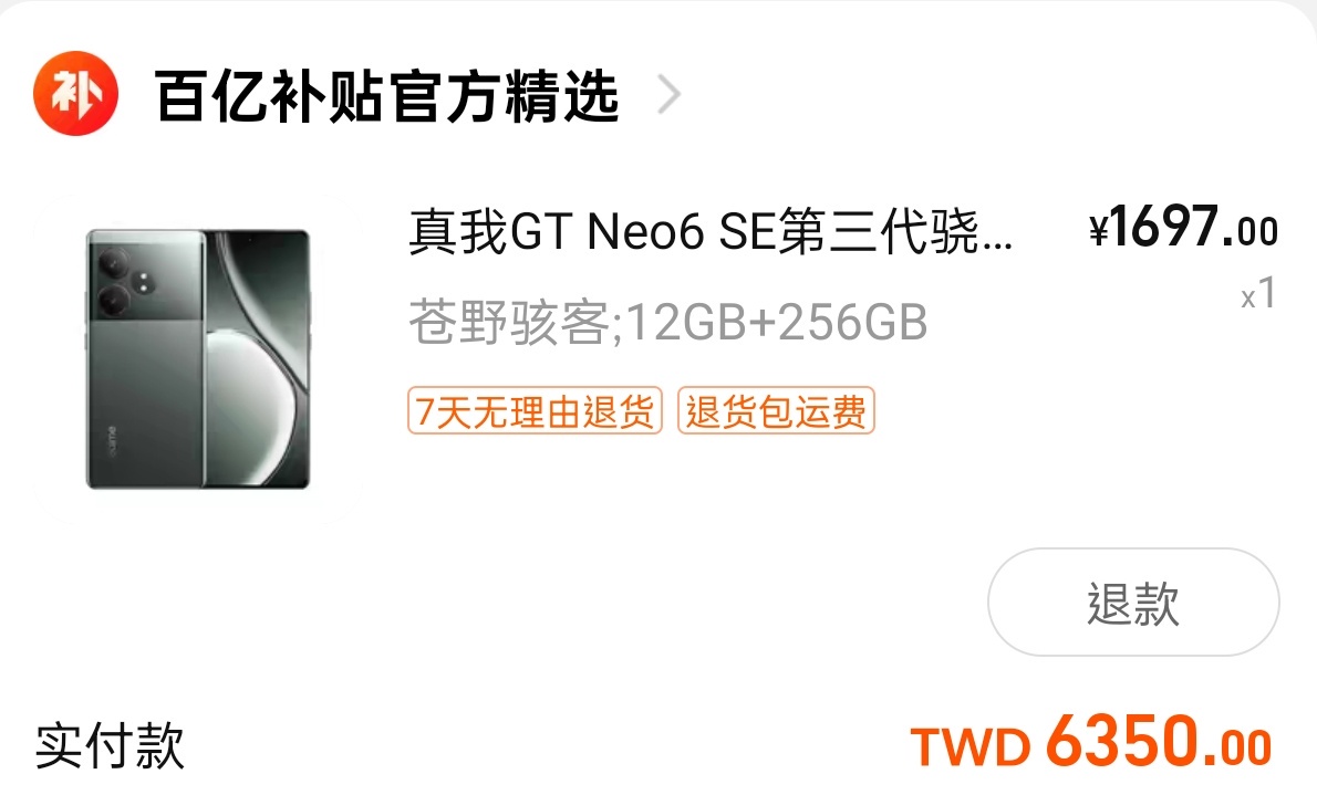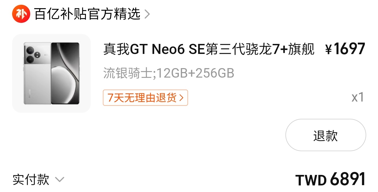 ※ 引述 《ykkdc (ykk)》 之銘言: :   : 瀏覽到這篇,對岸4/11發表realme GT Neo6 SE : https://reurl.cc/MO726W :   : 去年10月為了護眼在找LCD手機,後來趁著蝦皮國慶日優惠券購入realme 11x : 意外使用經驗還不錯,第一次用這牌子頗有好感 :   : 現在看到這款GT Neo6 SE定位中階機 : 看介紹很強調螢幕護眼,有硬體低藍光和類紙顯示 :   : ------ : 摘錄規格:高通Snapdragon 7+ Gen 3、6.78吋2,780 x 1264平面AMOLED螢幕、120Hz更新 : 率、全局最高亮度1,600nit/局部峰值亮度6,000nit、50MP Sony IMX882(1/1.953吋)+ : 8MP超廣角雙鏡頭、32MP Sony IMX615(1/2.74吋)前鏡頭、5,500mAh電池、100W長壽版 : 快充、IP65防塵防水、LPDDR5x RAM、UFS 4.0 ROM、尺寸162x75.1x8.65mm、重量191g :   : 提供 8GB + 256G、12GB + 256GB、16GB + 256GB、16GB + 512GB 規格,建議售價分別為 : 1,699、1,999、2,199、2,499 人民幣(約 7,560、8,895、9,785、11,120台幣) :   中午吃個飯回來手機螢幕就漏液 刷了一下米家跟真我 (不想花一兩萬買手機) 客服指引我現在有個 百亿补贴 這台最丐是1498 RMB (更正:1489) 就買了 https://i.imgur.com/Q7dURtM.jpeg